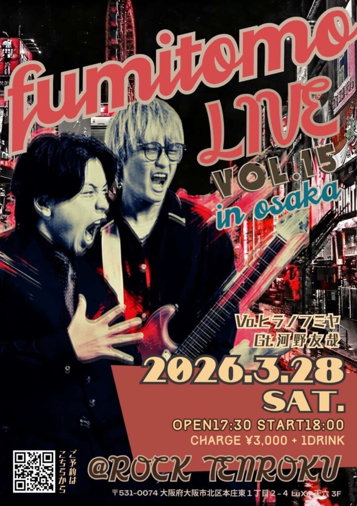 2026.3.28(土) 『fumitomo LIVE』VOL.15 in Osaka開催!! 詳しくはココをクリック!! Uncategorized 2026.03.02 2026.3.28(土) 『fumitomo LIVE』VOL.15 in Osaka開催!! 開場17:30 開演18:00